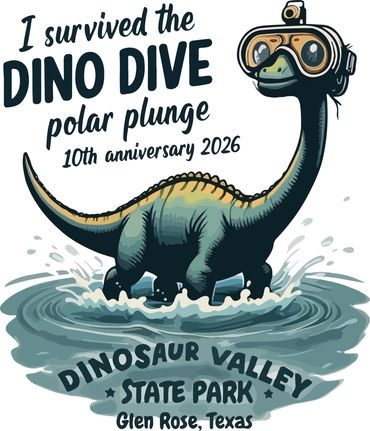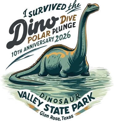 The 2026 10th anniversary medal is in production. This will be the largest and most iced out medal ever! Those who participate in the Dino Dive and have purchased a ticket will receive an official Dinosaur Valley State Park Dino Dive medal. These are the real deal. This is not one of those cheap kiddy awards. You deserve something awesome for braving the Dino Dive! You can reserve your ticket (includes medal) online through the PayPal link above. This also gets you into the park for free!